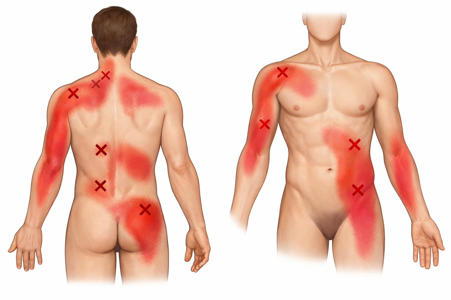 肩凝り、肩痛、背中凝り、腰痛、脚痛など、筋肉痛の半数以上は、痛みが報告される部位とは全く異なる部位に存在します。